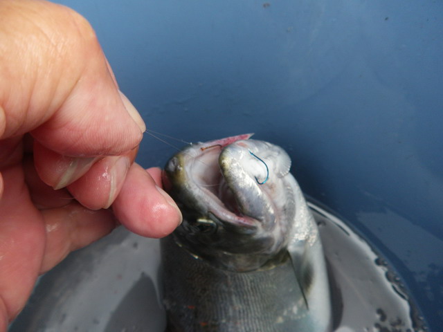 釣ったサツキマスから出てきた釣り針、アマゴ用仕掛けです。これで40cmのサツキマスを釣るのは無謀かも.後日 逃げれれた方とお会いしました。