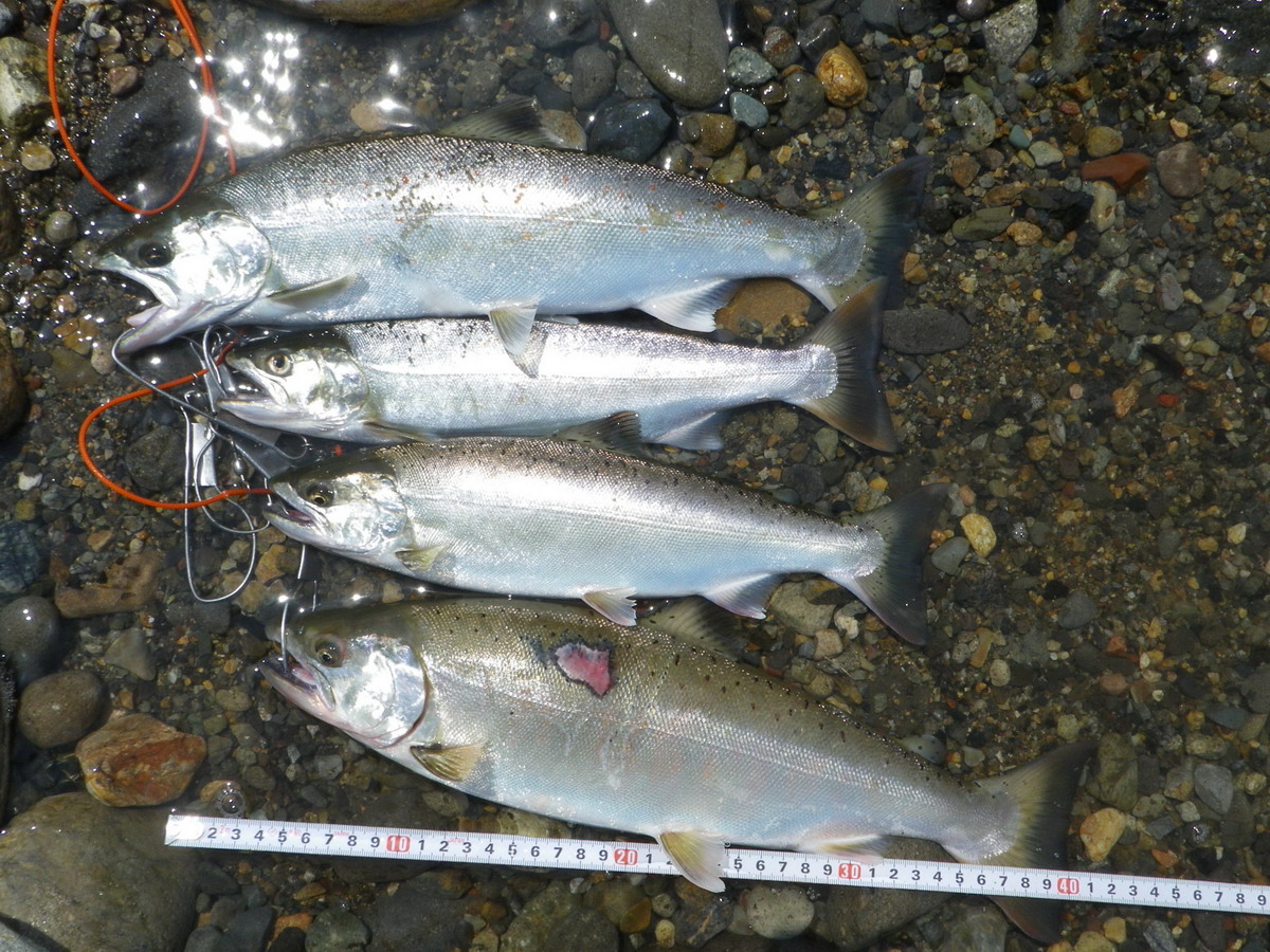 6月4日 中央管内 遡上して来る通り道で待ち伏せしました、水深3〜4mの全て同じポイントです。沈みブロックの近くです、サツキマスはブロックにも付き鱒。